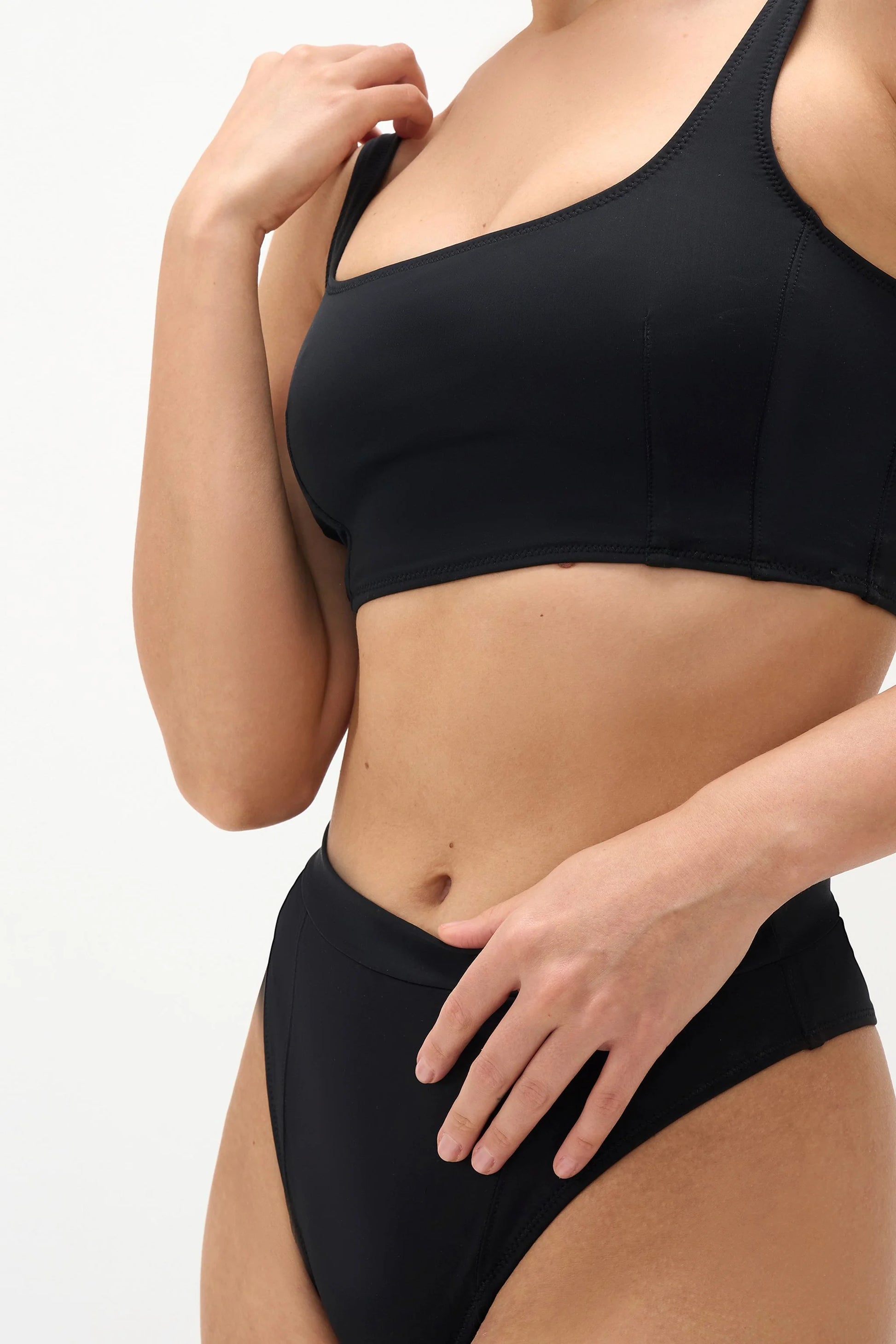 Elevate your performance with our eco-friendly Annet top. Perfect for dance, fitness, or as a swim top, this versatile piece ensures you look and feel your best. The unique design features rectangular cut-outs on the front and back, inspired by classic women's corsets, offering a modern twist on a timeless look.