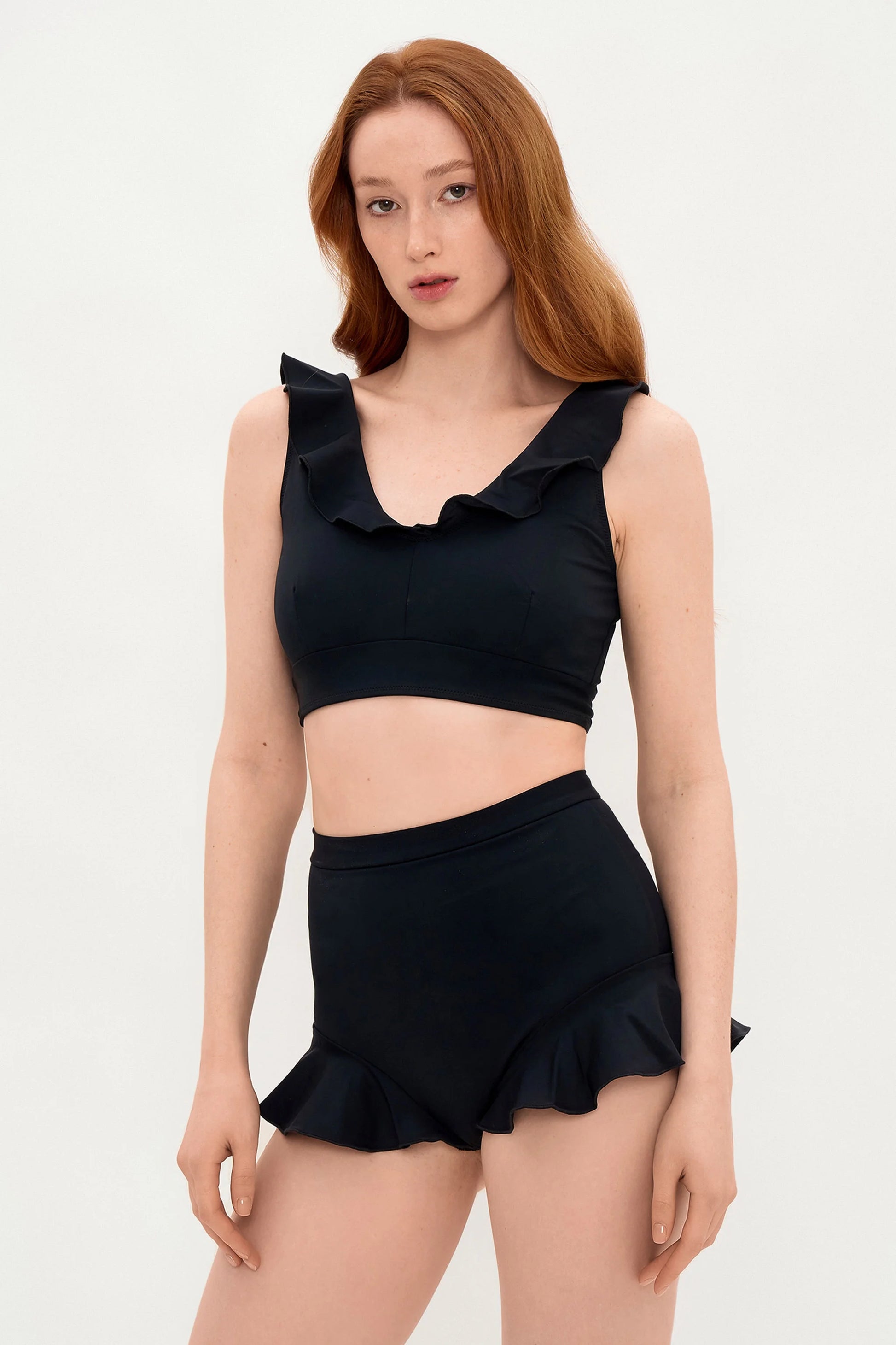 Perfect for dance, fitness, or as a swim top, this fun and flirty piece combines style and versatility to keep you looking and feeling great. The charming ruffled details on the straps and hem bring a lively energy to your workout wardrobe, while still offering the same comfort and support you need.