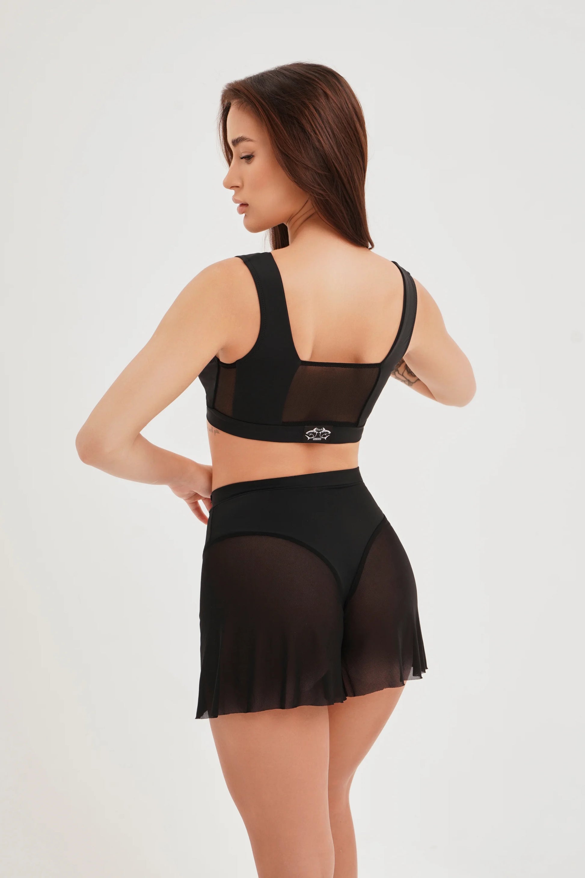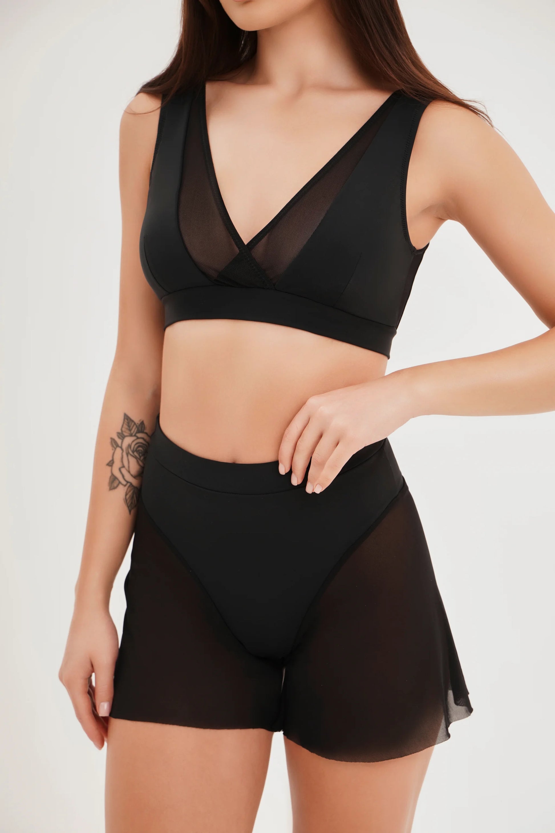 High-waisted shorts with mesh overlay legs for a flowing, elegant effect.